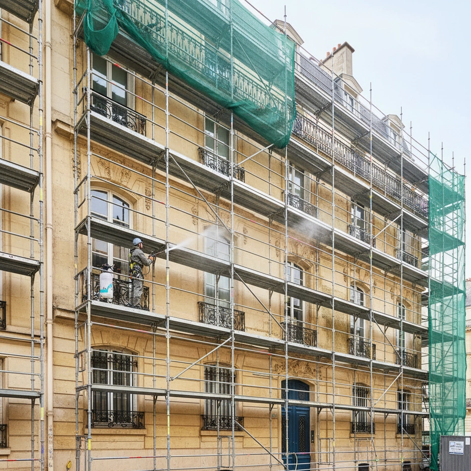 Nettoyage de façade, traitement anti-mousse et petits travaux (rejointoiement, fissures). Expertise en entretien de façade pour les bâtiments en Île-de-France.
